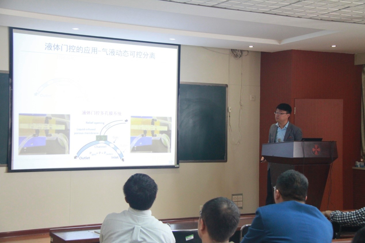 侯旭教授立足自然,受生物纳米通道的启发,研究设计了一系列人工仿生纳米通道系统,通过对通道的功能化实现了仿生纳米通道在光电转换系统、手性识别系统、传感器和纳流器件中的应用。随后,侯旭教授介绍了其设计开发的液体门控薄膜,该薄膜较普通商品化薄膜表现出了优异的抗污染性能,通过调节门控液和孔尺寸实现简单系统中的气液分离,包括气液动态可控分离和多相动态可控分离。深入浅出的介绍了其课题组在仿生柔性微流控系统的研究工作,研究涉及一系列可弯曲的有机/无机/金属-弹性膜微流控系统,特别是有机-弹性膜系统,可用于抗拉伸、弯折的仿生血管。