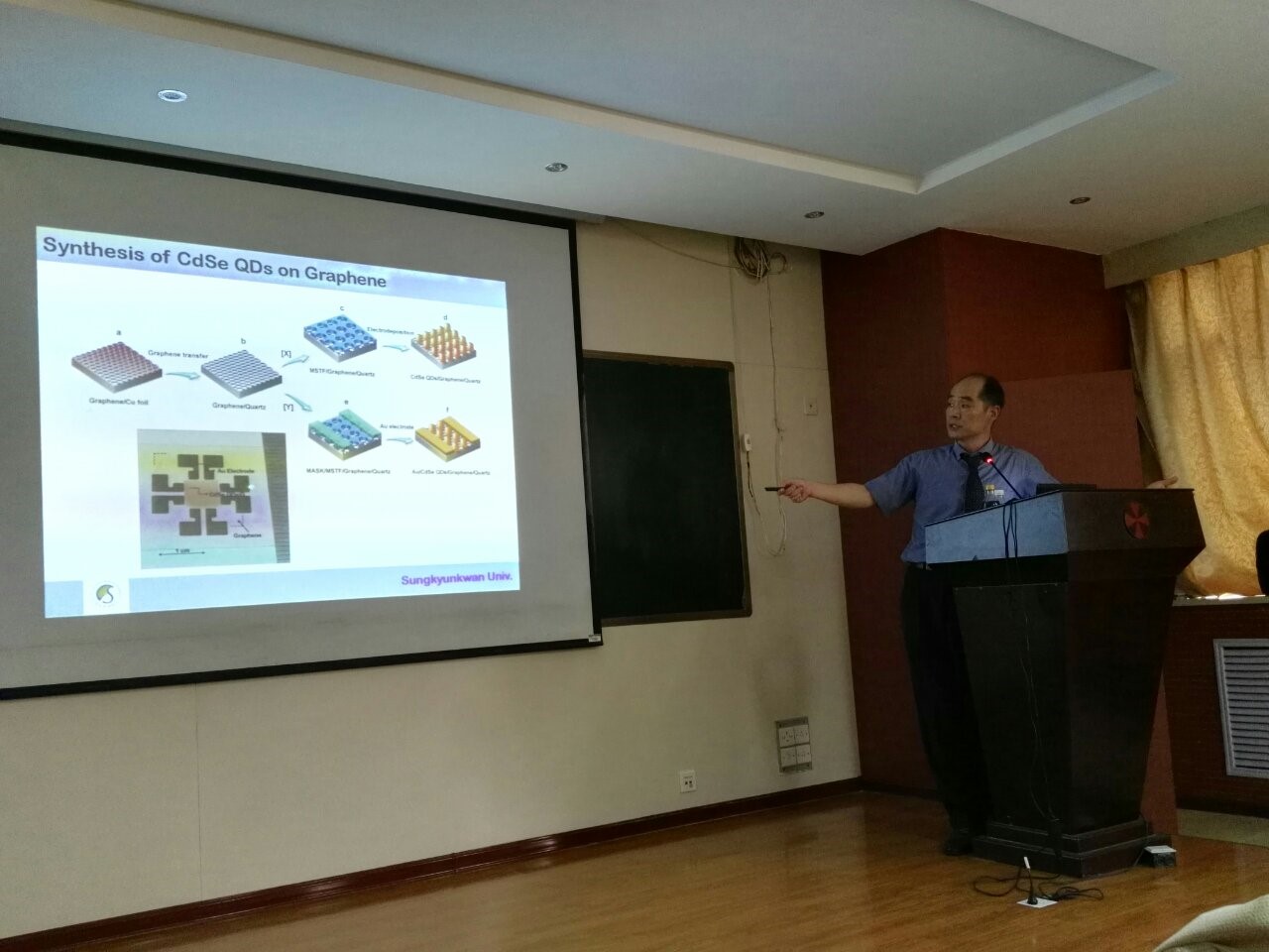 8月24日,应特种功能材料重点实验室邀请,韩国成均馆大学化学系教授,理学院经理Kwon Young-Uk教授来我实验室进行学术交流,并做了以“超声合成燃料催化剂和介孔材料的合成及应用”为主题的学术报告。本次报告由Kwon教授的博士毕业生,刘景玲老师主持,特种功能材料重点实验室相关老师和员工参加了此次报告会。